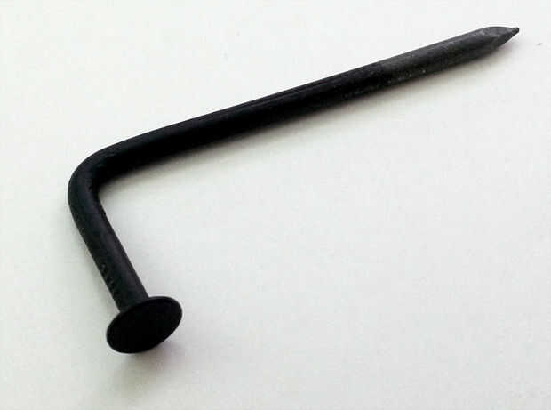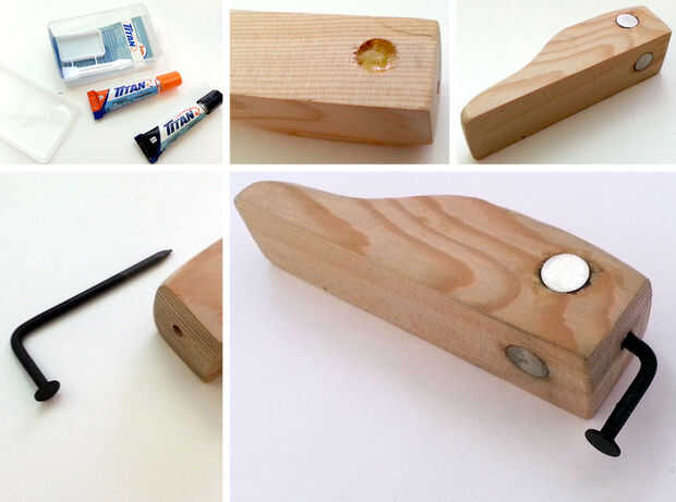La punta y la parte inferior 1/5"(1cm) de la uña también fue cubierto con una fina capa de epoxi, luego presiona en la abertura en el extremo del mango. La ubicación de la brida del clavo es importante establecer antes del curado de la epoxy, usted puede necesitar utilizar una cerveza embotellada para alinear la uña correctamente.
