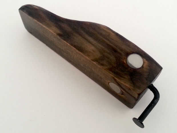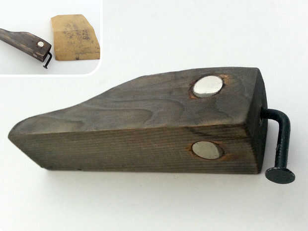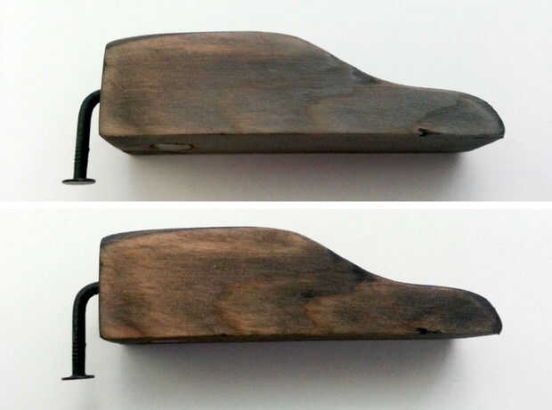 Después de unas cuantas capas de solución de té y vinagre el abrelatas de botella se enarenó ligeramente para quitar cualquier imperfección. Entonces, se aplicaron 3 costas de poliuretano para sellar la madera. En la figura #2 de este paso puede ver la diferencia en la riqueza de la veta con una capa de sellador de poliuretano.