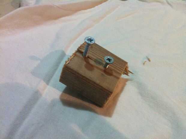 Perfore el medio tornillo en el pequeño pedazo de madera, de unos 2 CM (0,8") del borde por lo que está mostrando solamente 2.5 (1") CM.