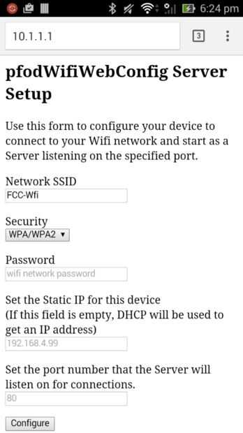 Una vez que haya completado la codificación final e instalado el módulo, puede utilizar el botón para activar el modo de configuración. Presionado el pulsador mientras se aplica energía al módulo. El módulo creará su propio punto de acceso WiFi, pfodWifiWebConfig, que será visible en su teléfono móvil. Escanear el código QR para obtener la contraseña para este punto de acceso y pegarlo en le instalación de WiFi para conectar tu móvil al servidor de web de configuración del módulo.