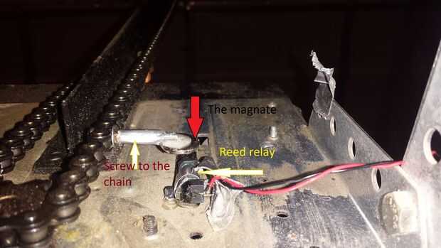 El relé azul, es un relé de láminas que se activará cuando el magnate acerca. No necesita fuente de alimentación. Hay un pequeño pero fuerte magnate conectado a un tornillo, que une a la cadena, agregó dos tuercas y luego algún pegamento para mantenerlo en su lugar y para asegurarse de que no daña la cadena. Tengo al magnate de una cubierta de la tableta.