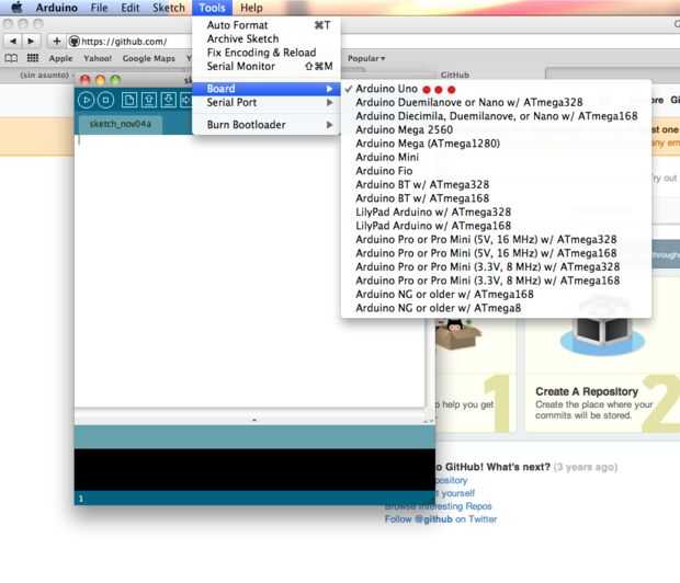 Para ello ejecutamos el software que descargaste en el paso 1. Una vez ejecute una pantalla como se ve abajo. En la pestaña "Herramientas" seleccionamos nuestro tablero que el Arduino Uno.