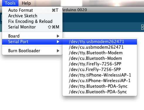 Seleccione el dispositivo de serie de la placa Arduino desde las herramientas > menú del puerto serie. En Mac, esto debe ser algo con /dev/tty.usbmodem