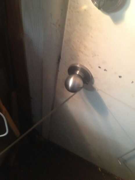 Tome el extremo de la primera cuerda y envuelva alrededor de la perilla de la puerta 5 veces y pone el ladrillo lanzó el lazo en el techo