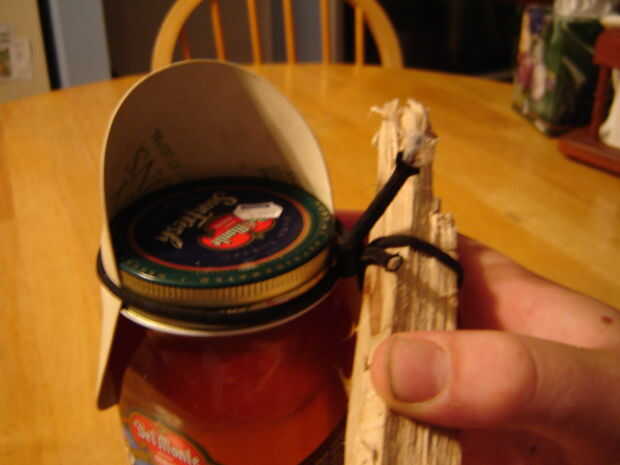 primero atar un lazo en la cuerda un poco más grande que el tarro y el palo. a continuación rizar el rizo alrededor de la jarra y el palillo y poner la apertura de la jar enfrente del palo tercer toque el palo muntill el bucle quede ajustada alrededor de la jarra