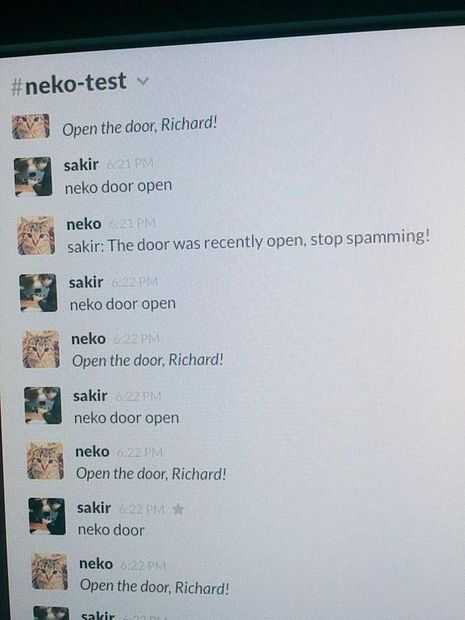 En el hackathon mismo hemos también construir neko que basa en Github Hubot. Por razones de seguridad no aceptamos ningún mensaje a sésamo de nadie pero neko bot. Así cuando queremos abrir la puerta estamos enviando el mensaje a neko neko envía el mensaje a sésamo. Debido a esto el código de sésamo es simple, seguro y confiable.