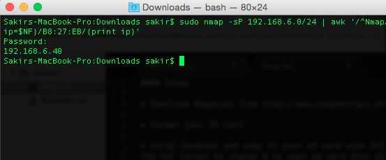 sudo nmap -sP 192.168.6.0/24 | awk '/^Nmap/{ip=$NF}/B8:27:EB/{print ip}' 6. Retire el pendrive del ordenador y enchufarlo para Raspberry Pi. Conecte un cable ethernet para Raspberry Pi y encienda.