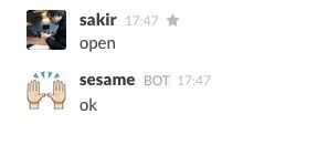 slack.on('message', function(message) { var type = message.type, channel = slack.getChannelGroupOrDMByID(message.channel), user = slack.getUserByID(message.user), time = message.ts, text = message.text, response = ''; if (user === undefined){ /* skip channel messages(skip the messages which are not sent to sesame directly) */ return true; } console.log('Received: %s %s %s "%s"', type, (channel.is_channel ? '#' : '') + channel.name, user.name, time, text); if (type === 'message') { if (text === 'open'){ openDoor(doorTimeout); response = 'ok'; channel.send(response); console.log(' responded with "%s"', slack.self.name, response); } } }); Ahora al abrir mensaje llega, llamada función de openDoor.