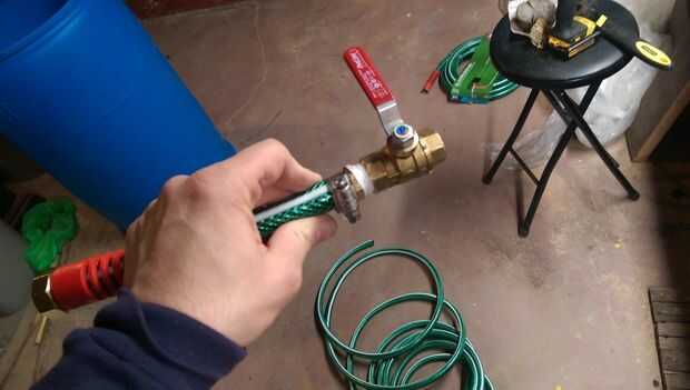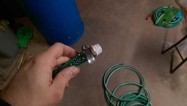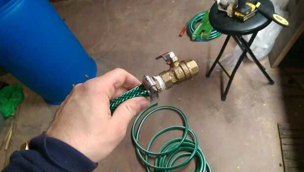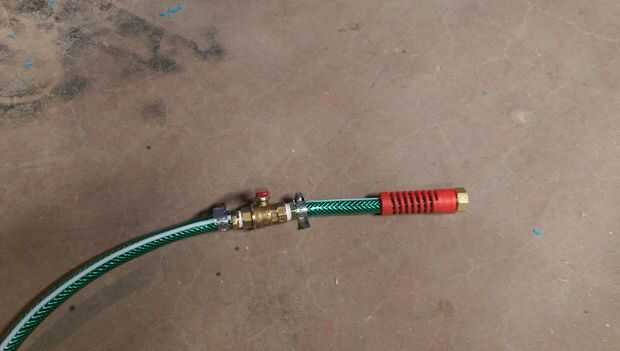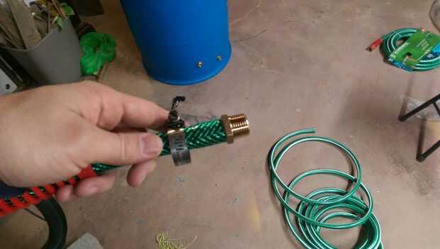 Mida sobre 6"- 8" desde el extremo hembra de la manguera y corte la manguera en dos pedazos allí. Utilizará dos púas de la manguera para estos próximos pasos de la pareja. Inserte una lengüeta de la manguera en la sección más corta de la manguera, asegurándose de que realmente empujar el extremo arponado en la manguera. Utilice una abrazadera realmente apretar hacia abajo para asegurarse de que no hay pérdidas. La mayoría de las abrazaderas de manguera se pueden apretar con un zócalo, que es mucho más fácil que con un destornillador, que es también una opción. Después de tener la lengüeta afianzado con abrazadera abajo bien, cubrir el extremo roscado macho con cinta de teflón para asegurar doblemente contra fugas. Luego enrosque el extremo roscado en su válvula de bola.