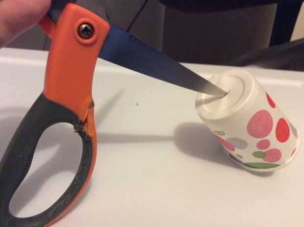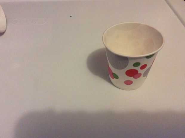 Tomar unas tijeras y hágale un agujero un poco más pequeño que la paja. Luego empuje la paja a través. Asegúrese de que la paja no es pegarse hacia fuera lejos de la parte inferior de la taza. Debe ser un poquito superior a la taza.