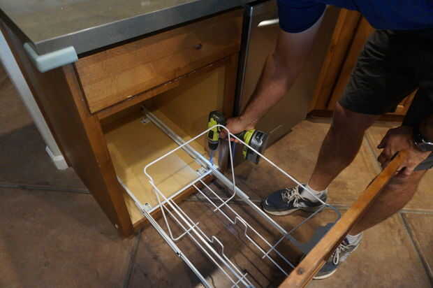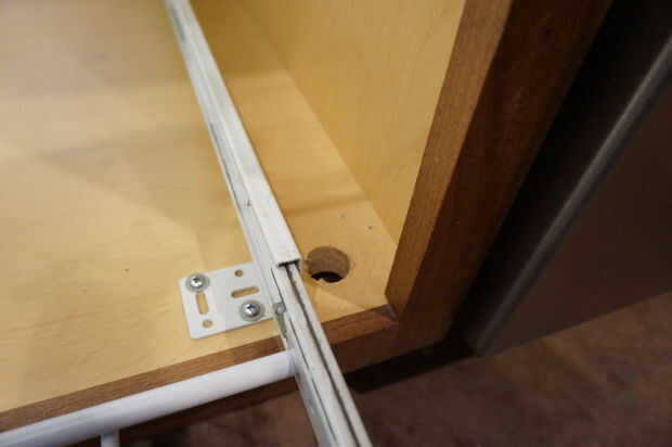 Ahora necesitará taladrar un orificio de 1" entre el borde del gabinete y la placa de retroceso que está debajo del gabinete. Asegúrese de que está en una zona que puede tanto atacar el interior de la puerta del gabinete, así como permitir el movimiento del bloque de madera.