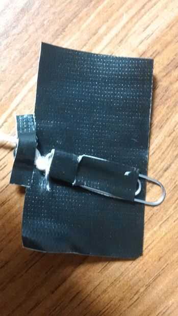 7. Coloque el clip de papel + cadena en el lado no adhesivo de la cinta. Un poco del clip de papel debe empujar hacia fuera sobre el borde de la cinta (como se muestra en la imagen).