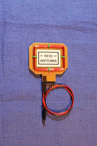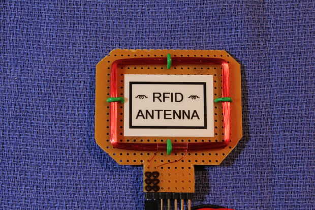 Una bobina de repuesto de la antena se montó a un pedazo de perfboard con un encabezado de 7 pin macho. Se utilizan solo 2 de los pernos, los demás añadir estabilidad cuando se conecta a la placa del experimentador. Esto resulta útil cuando experimentando con RFID.