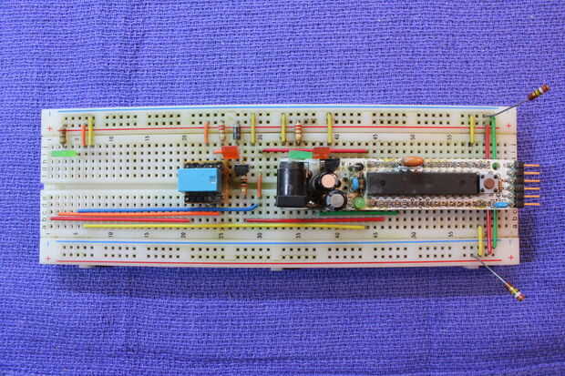 El diseño original fue construido sobre un zócalo de protoboard de experimentadores. Decidí dejarla en la toma y puesta en servicio. Trabajó bastante bien con un conector que accidentalmente desconectado cada ahora y entonces. Después de un año o así decidí que era tiempo para construir una versión más permanente.