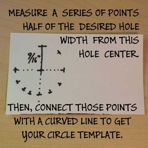 Así que, si tiene plantilla de círculo, podría utilizar. También puede usar una brújula, con el centro en el centro del agujero y el radio a 9/16"(que es la mitad del diámetro de 1 1/8"). Personalmente, yo sólo utiliza una cinta métrica para marcar varios lugares 9/16" lejos del centro, luego dibujó una curva circular para conectar esos puntos hasta que tuve mi plantilla de círculo.