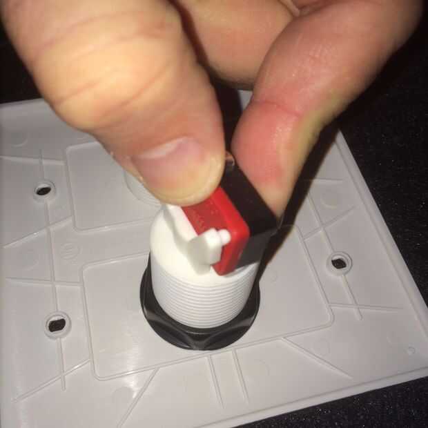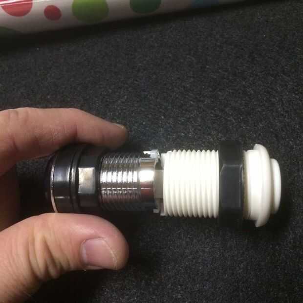 - Hilo de rosca el plástico grande "tuerca" en la parte posterior del botón arcade y apriételo hasta que esté casi firme.