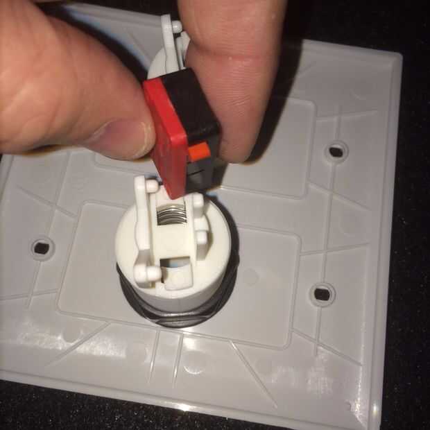 - Inserte el montaje del botón de arcade en los orificios de la placa del interruptor