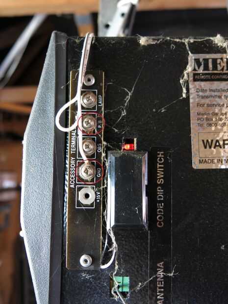 Opción 1, terminales del abridor: Echa un vistazo en el abrepuertas de garaje su uno mismo. Esta es la caja que alberga el motor y generalmente hace un fuerte zumbido al funcionar. En esto suele haber varios terminales para la conexión de otras partes y piezas. Encontrar las utilizadas para un mando a distancia por cable. En mi caso están marcados P B (probable de "botón") y GND (tierra de), pero son más fácilmente identificables por los cables de conexión de ellos y el control remoto. Si el abridor no tiene estos, su única opción es la opción 3. Para probar estos terminales para grab idoneidad un multímetro y mida la tensión entre los dos terminales. Si tiene un buen valor bajo como 3.66 V obtuve, debe ser seguro conectar el relé a estos terminales. Cualquier tensión en la región de 100-240 V es demasiado alta. Si no tienes una pared con cable remota, utilice esto como su punto de conexión y vaya al paso siguiente. De lo contrario ir a la opción 2.