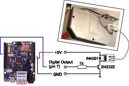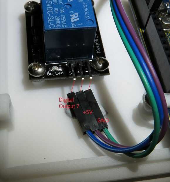 Primero conecte la placa de relé a la EtherTen con los cables de puente. El pin S (señal) en la placa de relé se conecta a la toma de entrada-salida Digital 7 EtherTen, la + pin a un + toma de corriente de 5V y la - clavija a una toma de tierra.