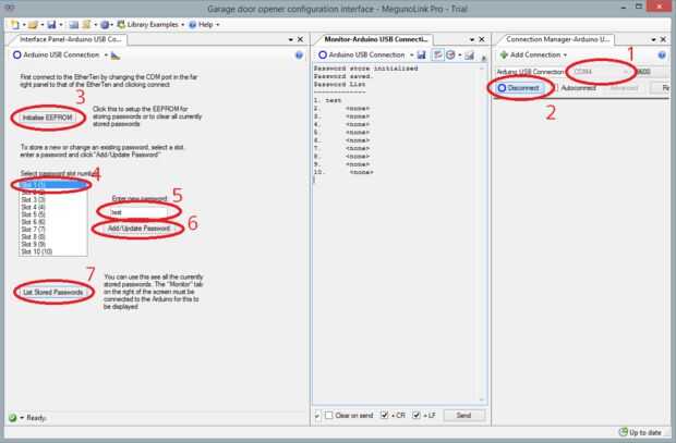 Suponiendo que MegunoLink Pro se ha instalado, inicie "abridor de puerta de garaje config interface.mlx", el archivo de proyecto que contiene la interfaz de configuración, desde el nivel superior de los archivos del proyecto que descargar desde el repositorio de GitHub del proyecto earier. Según las instrucciones contenidas en él, conectar a la EtherTen, inicializar el EEPROM, almacenar una contraseña y comprobar salvo haciendo una lista de las contraseñas almacenadas. Una vez que ha sido almacenada una contraseña, cargar la página del programa utilizando la dirección IP de nuevo y probar la contraseña. Si tiene éxito, debe oír un clic satisfactorio del relais y ver la página anterior!