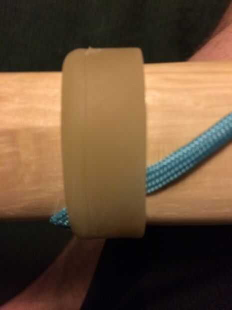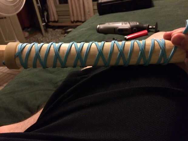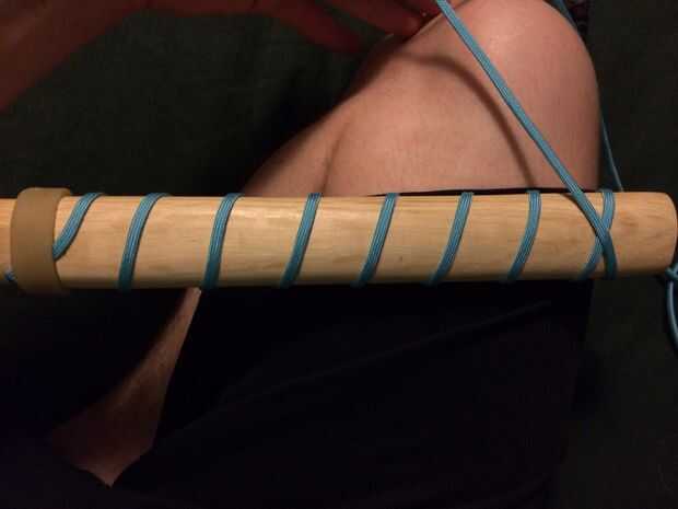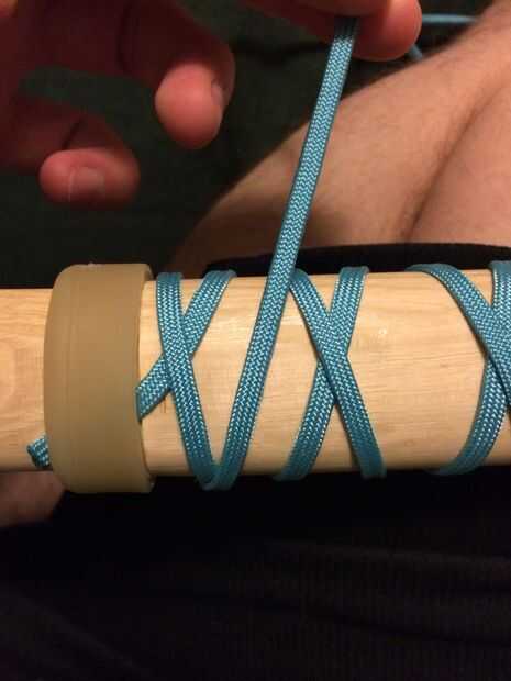 Por suerte para mí, mi bokken tenía un ojal de goma gruesa para sostener el cable en su lugar. De lo contrario se puede utilizar una banda elástica. Para mantener el nudo de la migración, puede usar una Dremel para tallar un canto para apretar el nudo en. Yo sugeriría hacer esto después de hacer su nudo, pero antes de que apriete. Estoy empezando un poco más abajo en el borde ancho de la empuñadura. Desde allí, llevar y hacer rotaciones completas 7. Ahora, hacer una rotación de 8 y Cruz en el último frente. Continúe envolviendo, cruzando la primera pasada en el centro de la empuñadura. De la tercera imagen vemos cómo el cable debe venir por debajo del punto partido. Hacer otro paso, va entre el primer pasa hacia la derecha. Ahora debería tener x, conectados por barras que se encuentran en la parte superior e inferior.