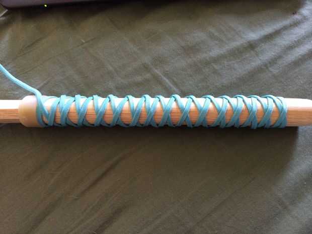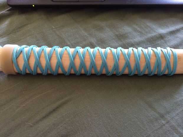 Lamentablemente no tengo una imagen clara de este paso. Tome el extremo de trabajo y ate bajo el abrigo de último en la parte superior de la empuñadura, luego sobre el abrigo en el lado de la empuñadura. Esto debería hacer que los cruces todos idénticos. La continua el bajo sobre patrón hasta llegar a la parte delantera. Esto completará un paso del nudo. A continuación nos será doble.