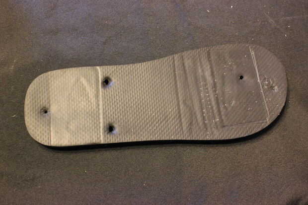 7. espuma, usé una vieja suela de un flip flop. Usé la espuma detrás de la piel cuando estoy perforando los agujeros para los cordones. Es más fácil pasar el cuero y la espuma. Primero probé a mi tabla de cortar pero solamente una porción pequeña de la punta del clavo pasó a través. He intentado algunos cuero apilada pero seguía siendo bastante rígido. No quiero tener la piel como una fuerza un clavo a través de la piel porque pueden meter mis dedos, y no es divertido la primera vez que hablemos otra vez. Si tienes una perforadora real que sería mejor pero usé un clavo ya que es todo lo que tenía.