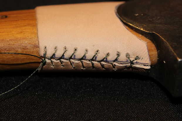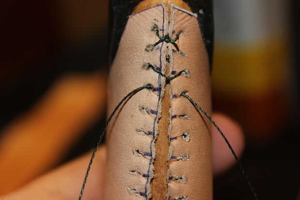 Puede utilizar el aceite de linaza y un trapo y limpie el cuero y mango con aceite de linaza. Hará que el cuero más maleable y cuando se seca mantenga esa forma mejor. En la tercera foto puede ver que hice un patrón de X para iniciarlo. Puse la cadena desde el exterior, lo trajo para arriba y a través del pliegue y en el siguiente conjunto de agujeros. Después el patrón X yo había atada como un par de zapatos. Para atar apagado he utilizado un nudo cuadrado. Recortar las cuerdas y estás acabado. El siguiente paso será fotos del producto terminado.