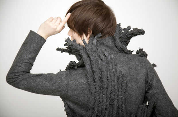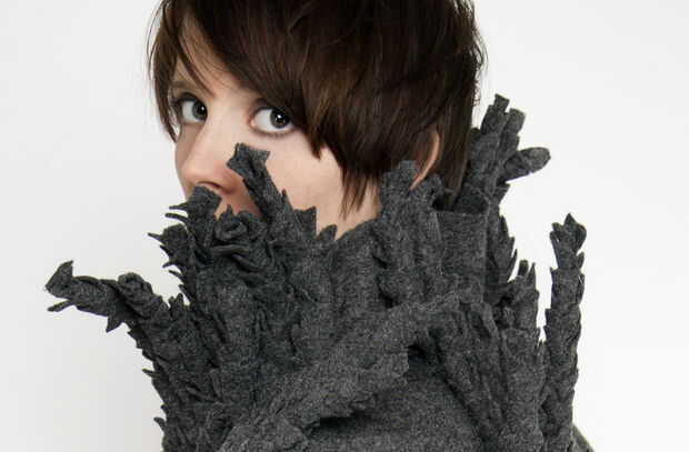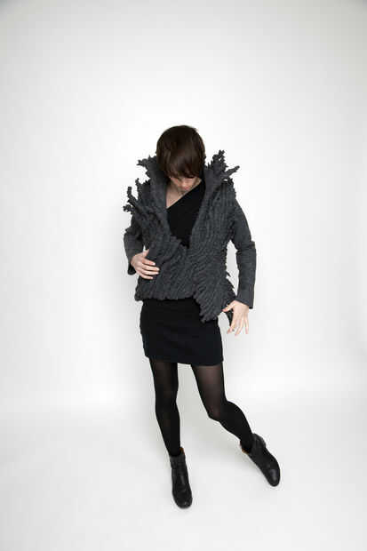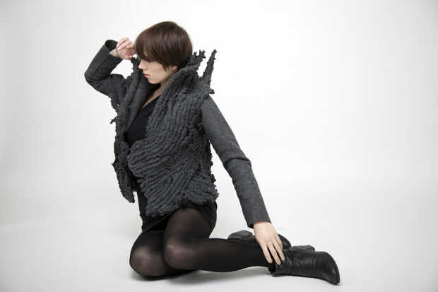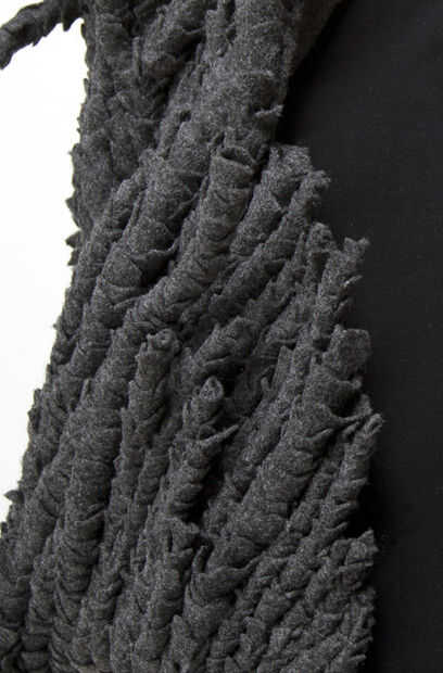 Después de una serie de pruebas de material, encontré que pude configurar procesos que las fibras se alinean de diferentes maneras. Me corte la lana en espirales irregulares y luego envuelve a la tela en hélices apretados.
