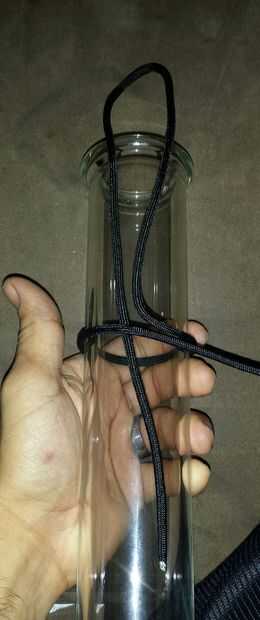 Cuánto paracord dependen de cuánto agarre te quiere, usé unos 15 pies de 6" de abrigo en mi bong 3" de diámetro. Necesita a algún cordón como en la foto a la izquierda con el final lo suficientemente largo para tirar de él más adelante. intentar dejar la cuerda vertical en la parte posterior de la pieza.