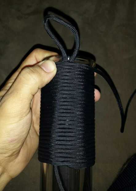 materialesPies de la pareja de paracordCuchilla con agujeros en el mangoPaso 1: Inicio abrigo Paracord de palo en el orificio superior.Paso 2: Mantener Mantener envolver la empuñadura del cuchillo.Paso 3: Casi listo Ahora volver aunque los agujeros e