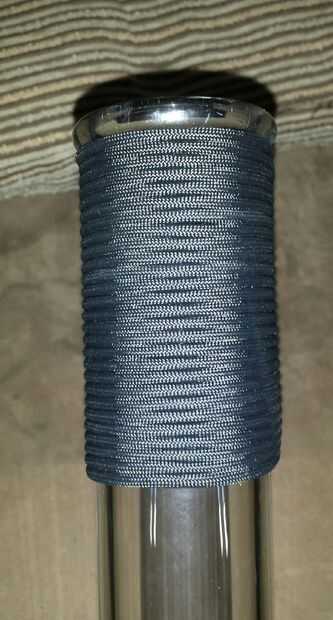 Después de terminar el abrigo y los detalles, dar un baño de agua de hervir a la cuerda durante 15 segundos y déjelo secar. paracord encogimiento del 5% a 15% su tamaño, por lo que agarra firmemente el vidrio. tratar de darle una buena tensión mientras esté para un mejor resultado. Golpes tácticos.!!!!!!