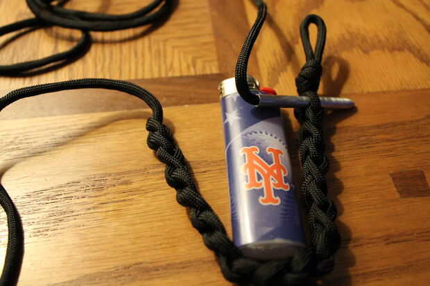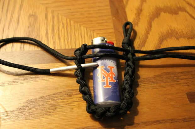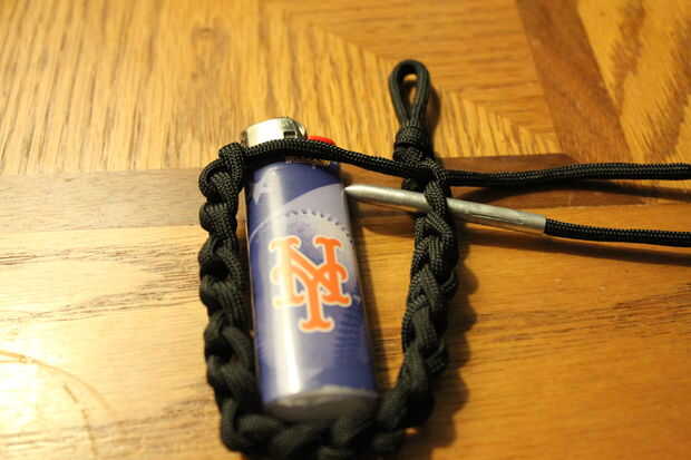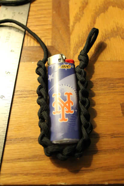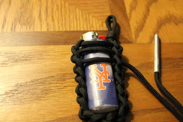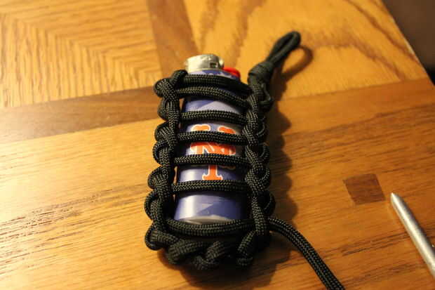 Te darás cuenta que el tejido de sinnet de cadena tiene una forma triangular a él. Asegúrese de que la parte superior del triángulo frente para que 1) el lado plano apoye contra el encendedor para darle más estabilidad 2) la forma cónica del tejido al exterior hace más cómodo