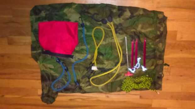 Nota: Usted debe ser capaz de hacer con solo un poncho y algo de cable, extras tales como estacas de tienda de campaña y cuerdas del amortiguador auxiliar facilita mucho la construcción Matute pero no son necesarias.