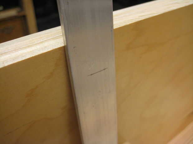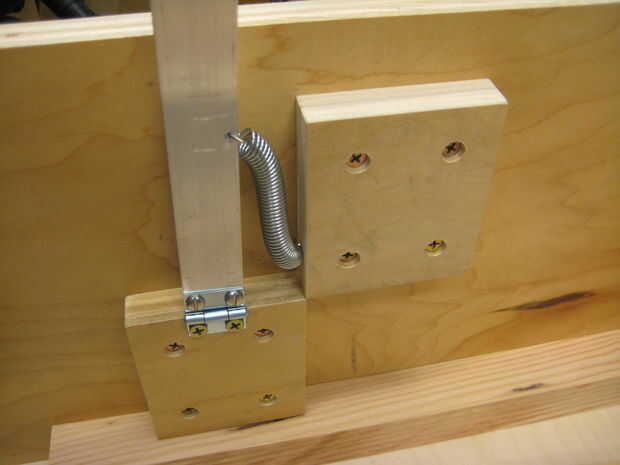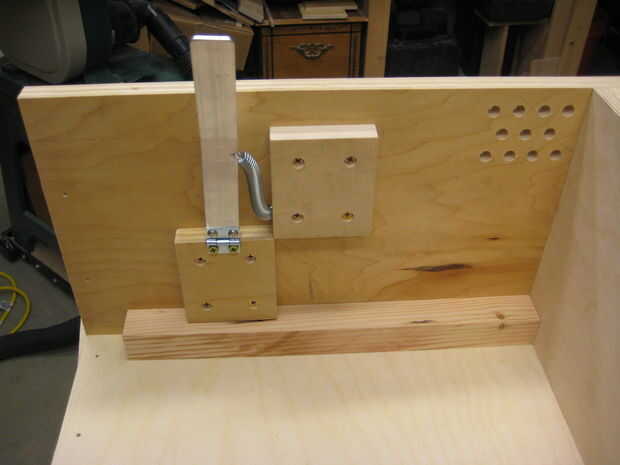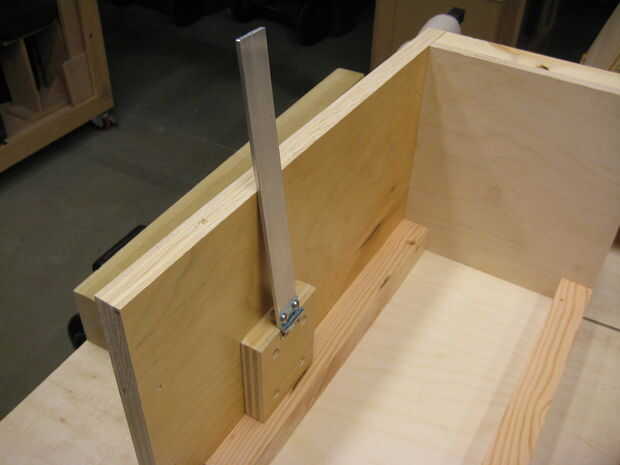 Se ha añadido una pequeña pieza rectangular de madera contrachapada de 3/4" al interior de la caja para sujetar la bisagra al. Necesitaba una manera de conseguir la bisagra a poca distancia de la pared frontal de la caja podría girar hasta la posición vertical.