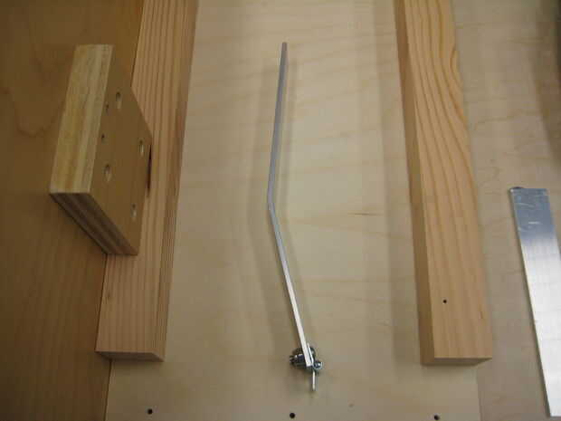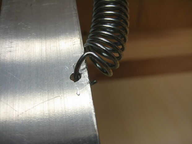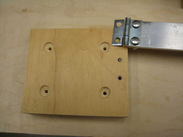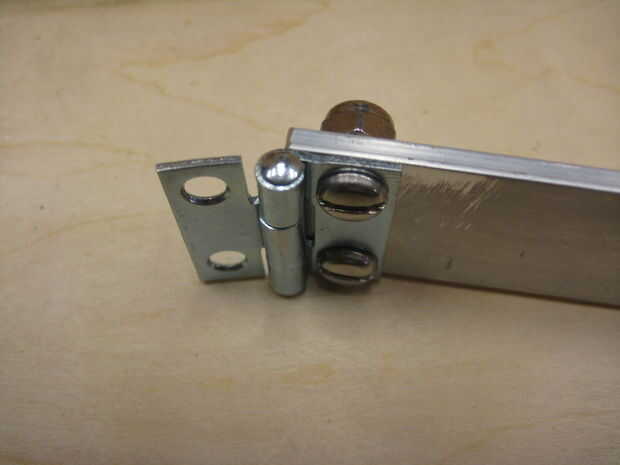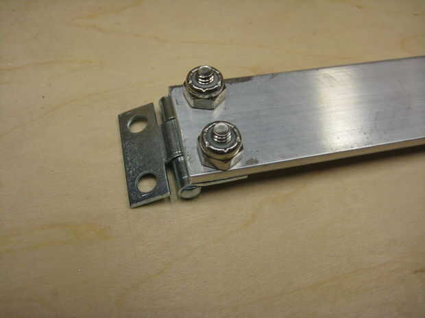 Cortar un trozo de aluminio plana cerca de 8 pulgadas de largo y adjuntarlo a la bisagra de 1' con dos orificios como se muestra en las fotos. Usé 2 #8 x 1/2" tornillos para fijar a la bisagra.