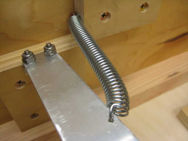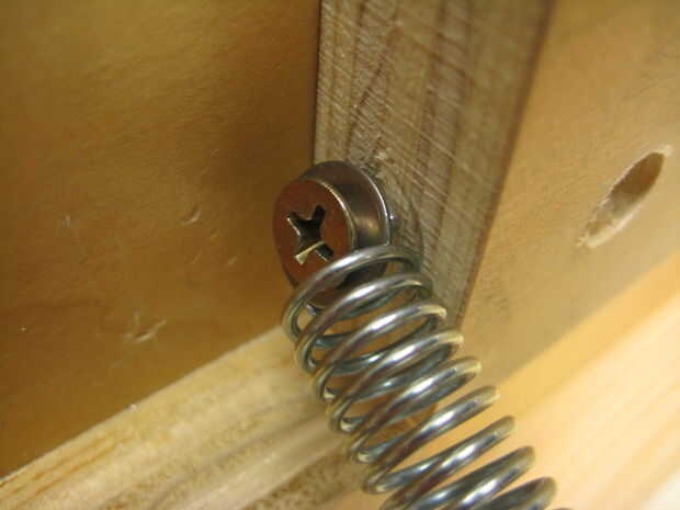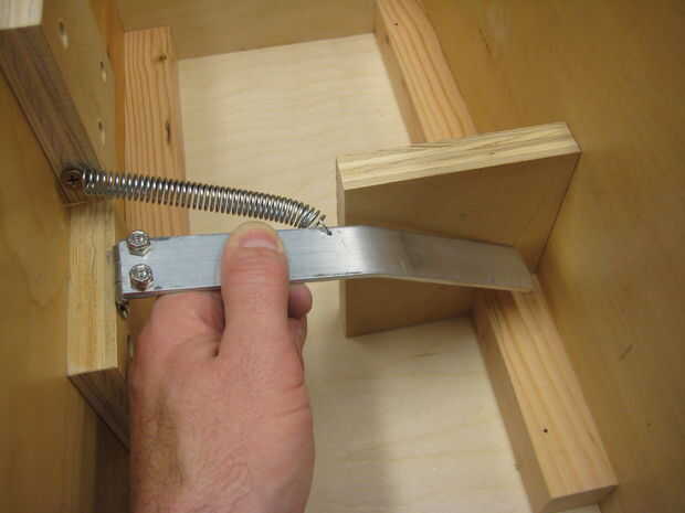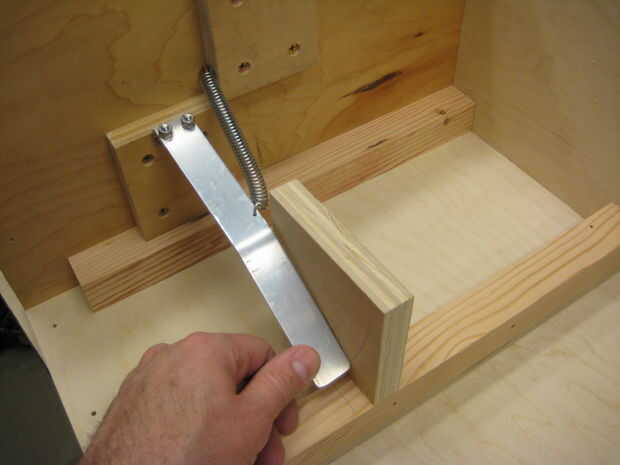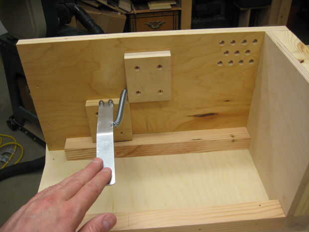 También he añadido una pequeña pieza rectangular de madera contrachapada de 3/4" al interior de la caja para colocar el resorte. No quiero tener una oportunidad en la perforación a través de la parte delantera de la caja para el tornillo anclar el resorte.