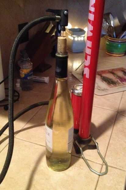 Conecte la manguera de aire de la bomba o compresor. Sostenga la manguera para no doblar el tubo de latón o rotura. Asegure la botella de vino para que no caiga al abrirlo. Bomba de aire en la botella. Mi bomba tiene un medidor de presión y fue a unos 80 psi. antes de que el corcho comenzó a moverse. Cuando el corcho se movió, se movió rápidamente y salió de la botella inmediatamente. (Botellas plásticas de soda de 2 litros se han probado y estalló a unos 120 psi. Una botella de vino de cristal es más fuerte que una botella de plástico de refresco. Personas han estado utilizando versiones comerciales del abrelatas de botella de vino la presión de aire con seguridad durante años.)
