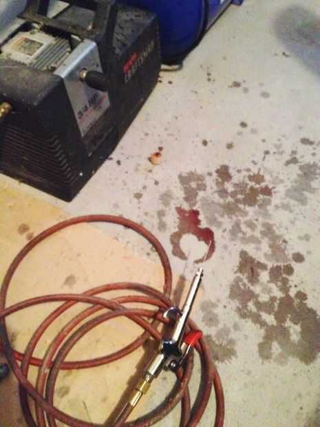 Conecté una pistola de aire a un compresor de aire y unida una aguja de inflación mayor a la pistola de aire. Este compresor no tiene un tanque adjunto. Configurar la presión de aire de 100 psi. El corcho salió rápidamente, pero también lo hizo vino, como se puede ver en las manchas en el piso. Casi la misma cantidad de vino encontró el frente de mi camisa. Puedes ver lo que quedaba del corcho en el suelo. (Porque mi compresor de aire es sin tanque, mucho menos de 100 psi. acumulado antes de que el resto del corcho fue expulsado.)