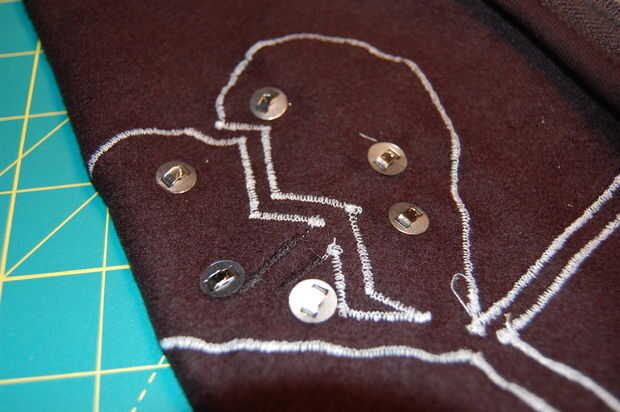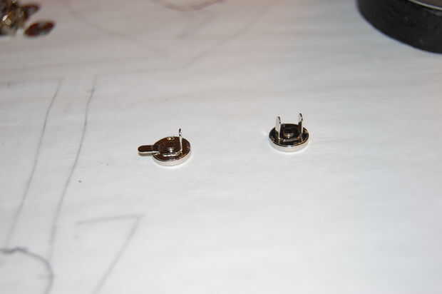 Una vez que los broches se sueldan en, poner el PCB en la capucha donde desea ser unido. Marque la ubicación de los broches de presión en la tela. Luego empuje las lengüetas para la otra mitad de los broches de presión a través de la tela en esos lugares. Usted debe ser capaz de separar las fibras de la tela suficiente para empujar las fichas a través de sin cortar a la tela. Deslice la placa de respaldo en y doble las lengüetas hacia abajo para asegurarlo el cierre.