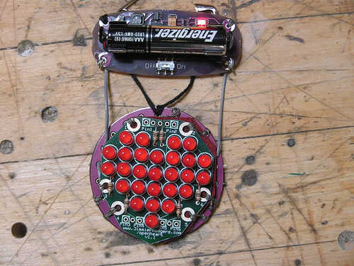 Utilicé dos piezas de alambre trenzado para hacer los colgantes las conexiones entre la placa de la batería y la tarjeta principal. Tuve que superar el + en el tablero de la batería más a uno de los pines no utilizados en el extremo opuesto del portapilas para mantener el alambre colgantes soportes simétricos. Utilicé hilo conductor para ello; se puede ver en la parte posterior de la Junta de la batería.