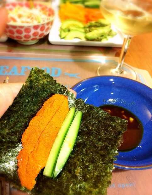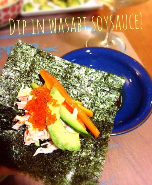 Y en segundo lugar pongo carne de cangrejo, aguacate, algunas veges con tobiko por encima del abrigo!