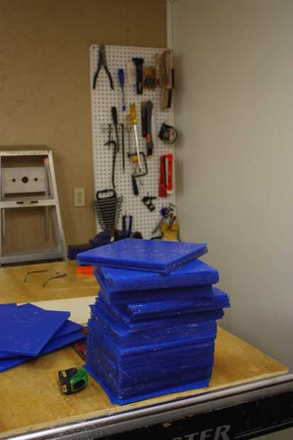 El primer paso implica tomar el completo de 4' x 8' hojas de acrílico y reduciéndolos a una pila de hojas de 9,5 "x 9.5".