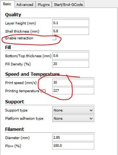 - Retracción - recomendamos desactivar esto como el movimiento de retracción crea una tensión en su filamento flexible y serían más propensos a la obstrucción de la boquilla o pulido del filamento.