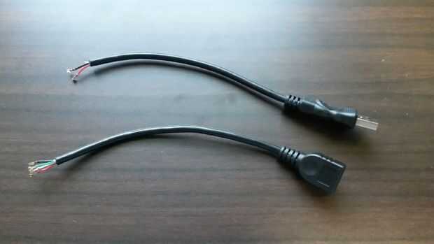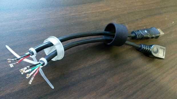 Corte el cable USB con el extremo macho 8.25" de largo. Tomar el extremo hembra y alineados con el conector macho y cortar para emparejar (cerca de 7,75" de largo). Tira de. 5" de la cubierta exterior y protección de los extremos y corte a los cables verde y blanco en el extremo macho como no son necesarios. Apriete los pernos Hirose en los cables de 6.