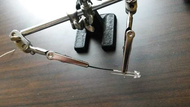 Soldadura el. 20" despojado el extremo del cable negro corto a la pata corta del LED (cátodo) y la soldadura del. 20" despojado extremo del cable rojo corto en la pierna más larga del LED (ánodo). Deslice el tubo del encogimiento del calor 1/16 de pulgada sobre las patas del LED y utilizar una pistola de calor para reducir el tamaño del tubo. Doble el pasador de Hirose a los extremos de los cables. Conecte el conector de 2 pines de Hirose con el cable de Red al puerto 2 y el cable negro al puerto 1.