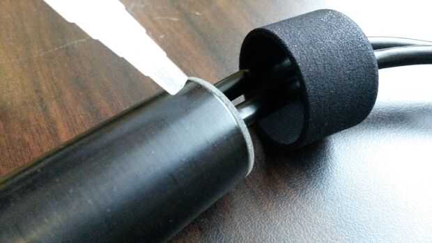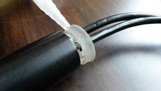 Después de 10 minutos el epóxico debe endurecerse, pero todavía puede ser pegajoso y gomoso por lo que no toque el epoxi. Complete el montaje del núcleo de poder colocando el empate Rip al cable femenino y se usa para sujetar los cables contra el tubo de aluminio.
