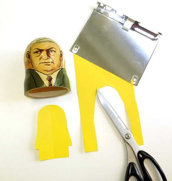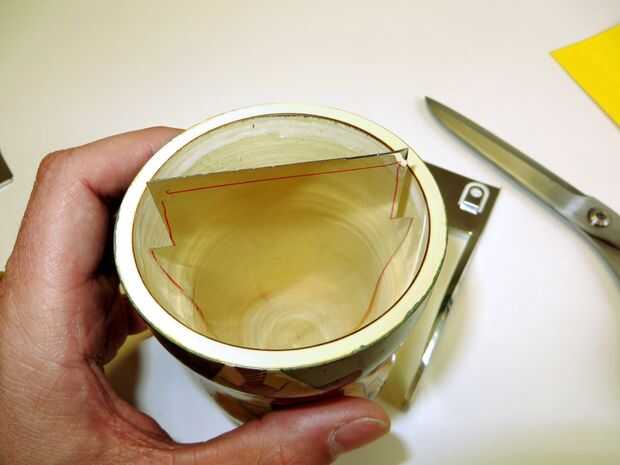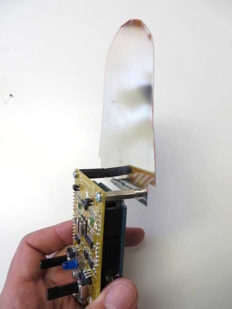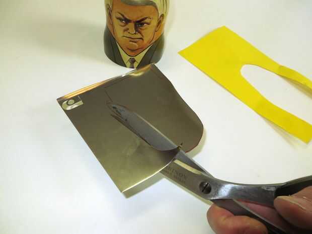 Para un Matryomin, a diferencia del clásico Theremin, la antena debe ocultar dentro del instrumento. Para ello es mejor utilizar una hoja de metal cortado al tamaño correcto. Comienza por cortar la forma aproximada de la parte superior de la matroschka de un pedazo de papel. Ahora puede probar si la forma se adapta o corta más. Una vez has encontrado la forma perfecta para la antena corta de una hoja delgada de metal. Metal fino puede cortarse con un fuerte par de tijeras. (Tip de reciclaje: este tipo de hojas de metal a menudo se utilizan como protección dentro de las computadoras u otros dispositivos electrónicos).