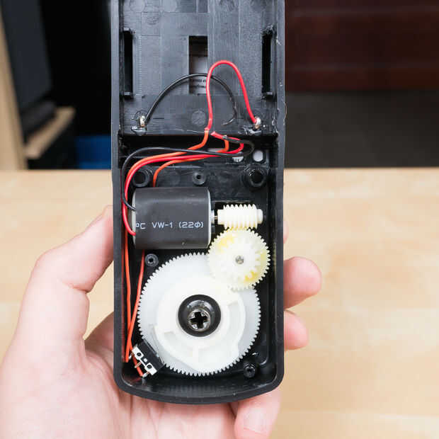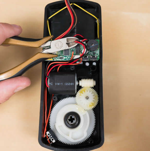 Abrir la cerradura y desmontar la placa metálica que se muestra en la foto. El cerrojo de seguridad seleccionamos utiliza un motor se deslice dentro y fuera de posición, con un pequeño interruptor que indica cuando está bloqueado. Usted tendrá que cortar casi todos los cables y electrónica de la cerradura. Lo único que necesita para mantener es el motor, interruptor de posición y la batería.