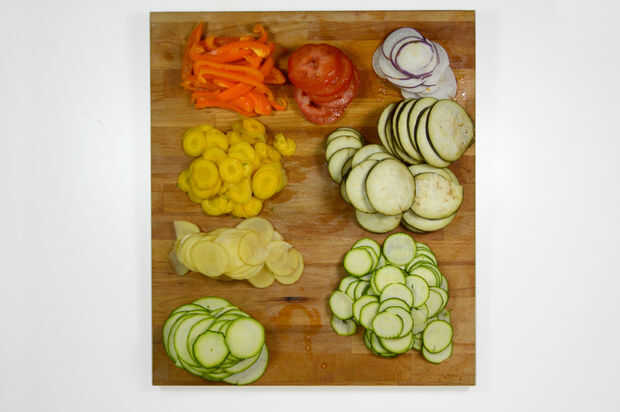 Utilice un cuchillo afilado o, mejor aún, un japonaise de mandolina para cortar lonchas muy finas de cada ingredientes.